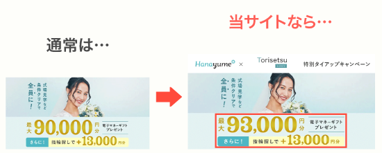「結婚式の割引」+「全員もらえる93,000円」はハナユメだけ!