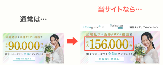 「全員もらえる156,000円」+「結婚式の割引」はハナユメだけ!